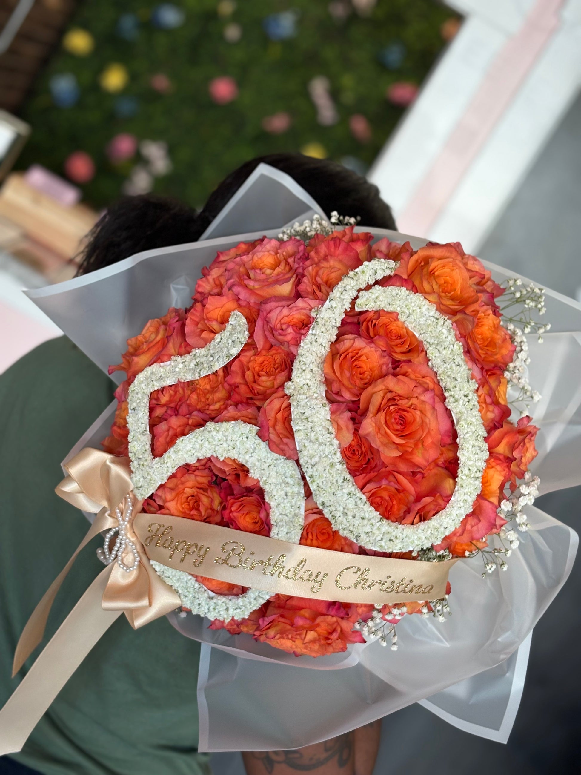 When words fall short, this bouquet speaks volumes. The Showstopper is a 50-rose luxury arrangement designed to leave an unforgettable impression. Fully customizable, it features your choice of blooms, a premium satin ribbon personalized with any message, and a handcrafted babyās breath letter or number nestled in the design.